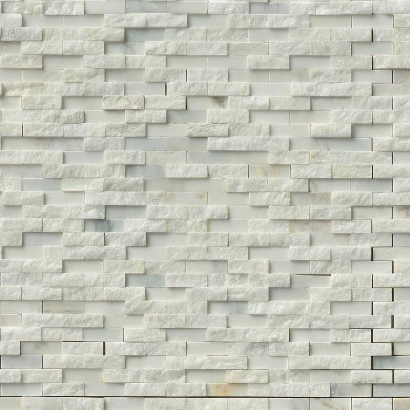 Greecian White Marble Split Face Mosaic Hatches feature soft white tones and subtle veins in a dramatically raised texture.