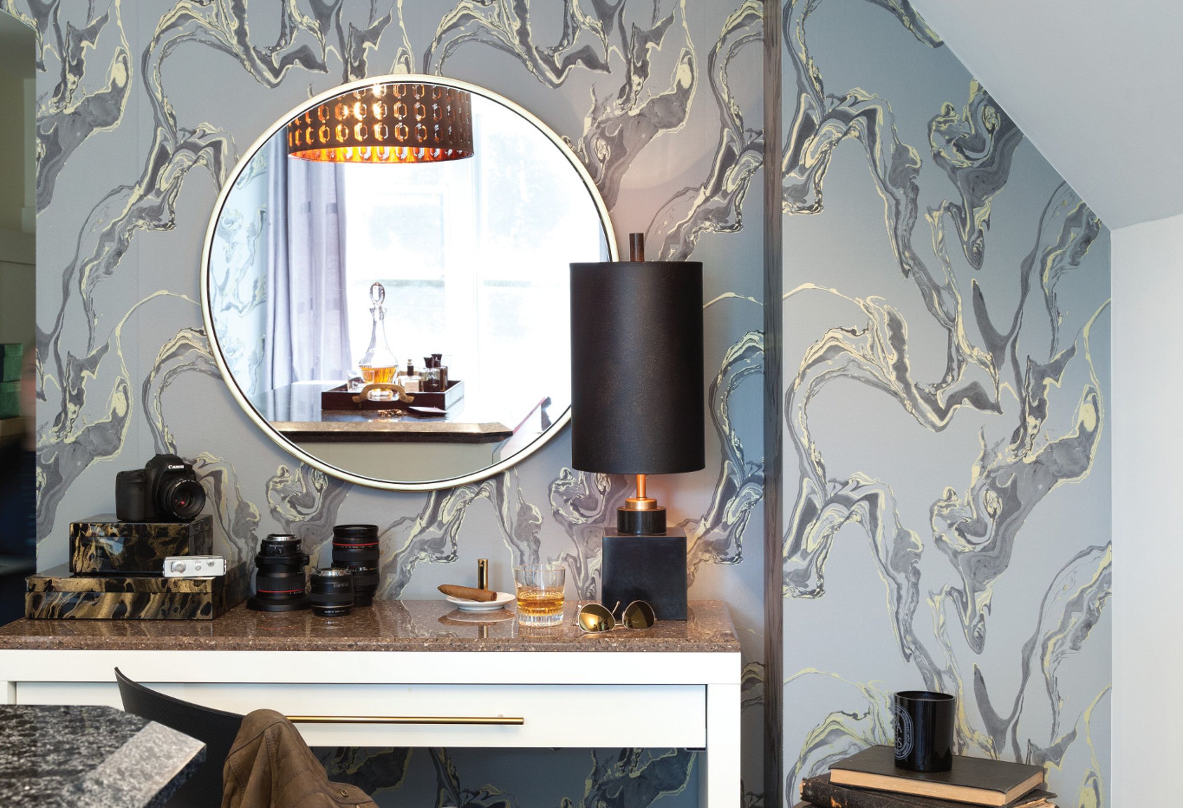 Like the sunlight that pierces the mysterious shadows of the wondrous Rosslyn Chapel, this design’s striking metallic golds shimmer against a nuanced background of warm taupe and tans.